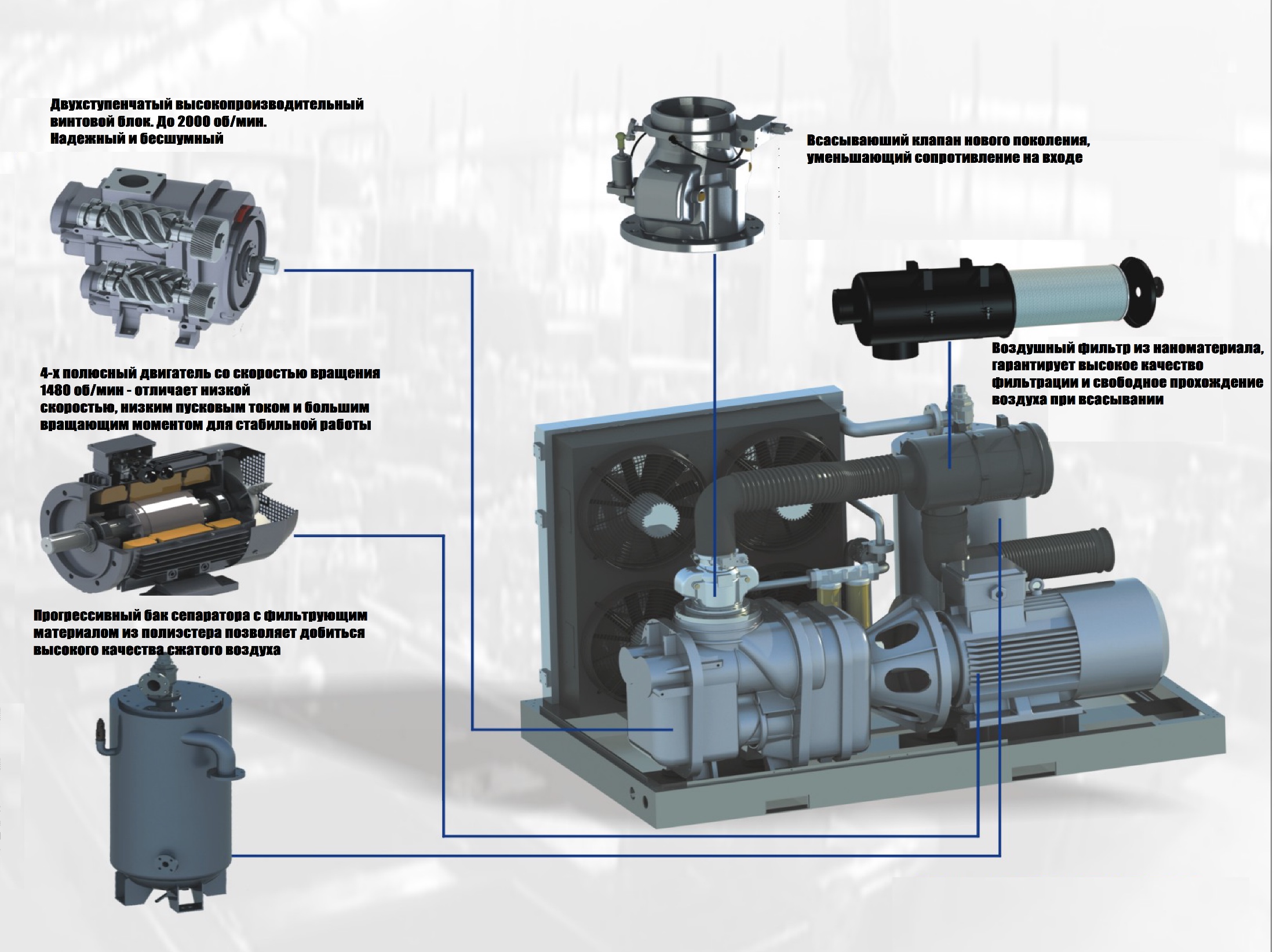 - Повышенная эффективность благодаря уменьшению теплоты сжатия и минимальному повышению температуры в камере сжатия.