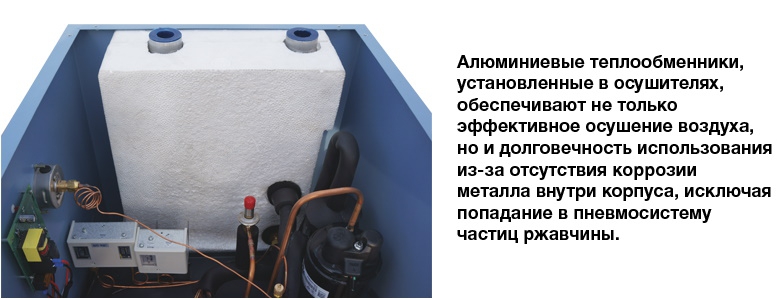 Во время работы, осушитель потребляет совсем небольшую мощность, несмотря на свою высокую эффективность. При установке модели мы рекомендует также применять в одной системе циклонный сепаратор и магистральные фильтры. Такая компоновка зарекомендовала себя, как наиболее удачная, с точки зрения качества получаемого воздуха.