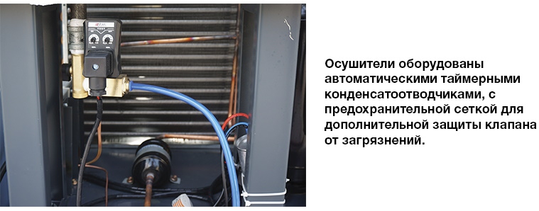 Полученный воздух практически не содержит влаги. Конденсат, накапливаемый в сепараторе, выводится наружу с помощью автоматического таймерного конденсатоотводчика. Для ограничения размера установки и предотвращения образования конденсата на внешней стороне трубопровода охлажденный воздух собирается перед выходом из осушителя и предварительно нагревается в теплообменнике воздухом, входящим в установку.